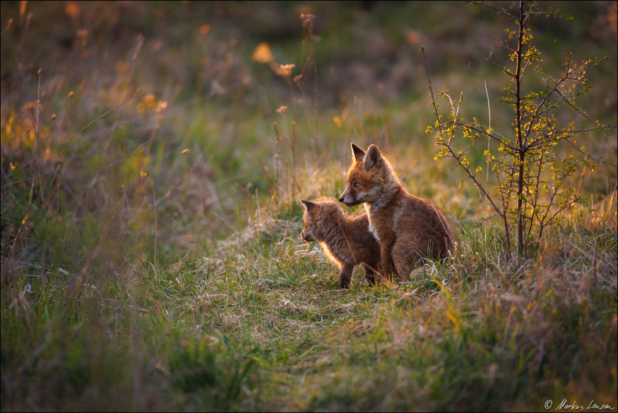 Zwei Fuchswelpen sitzen im Morgenlicht im Gras. Der größere Welpe beschnuppert sein Geschwisterchen liebevoll