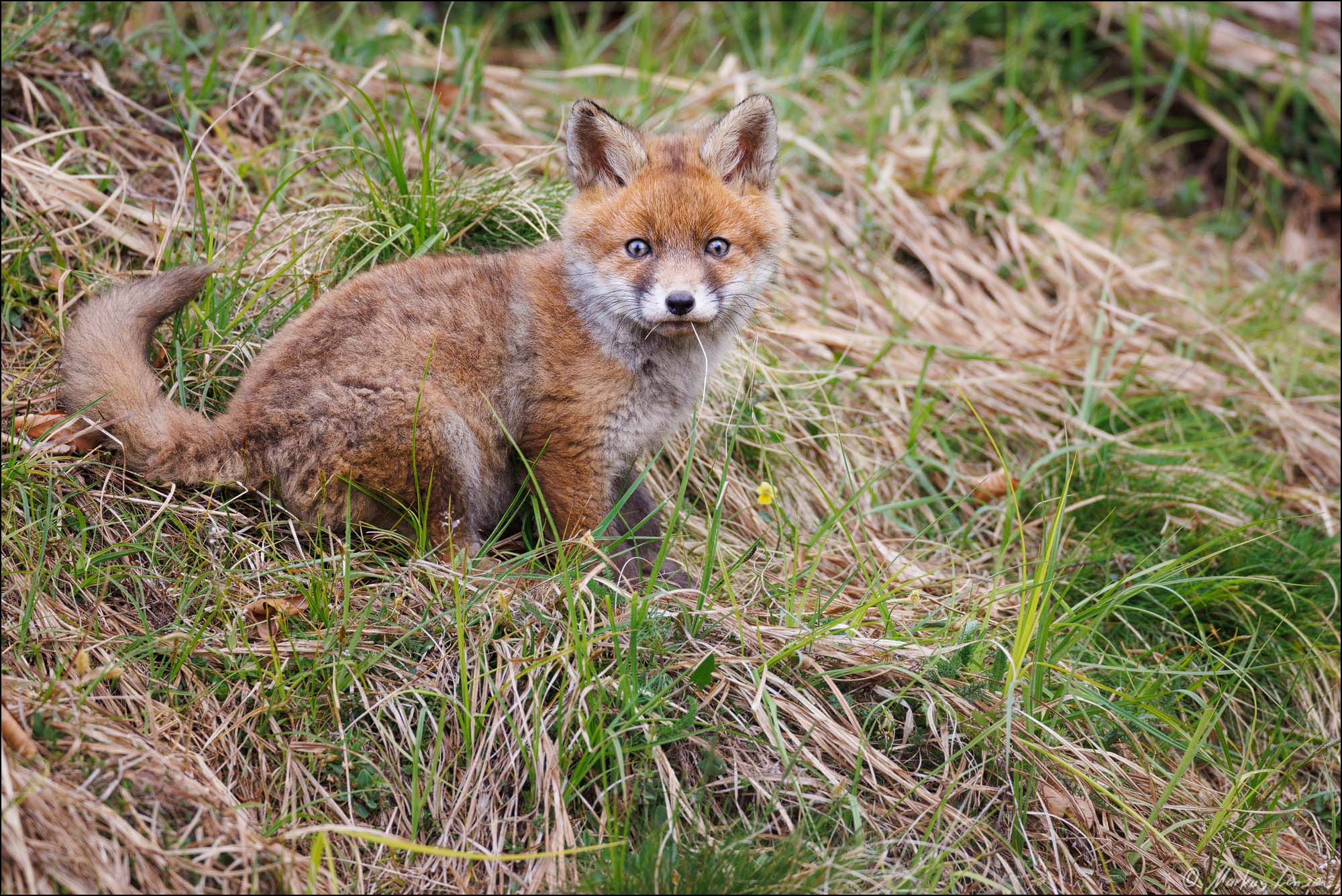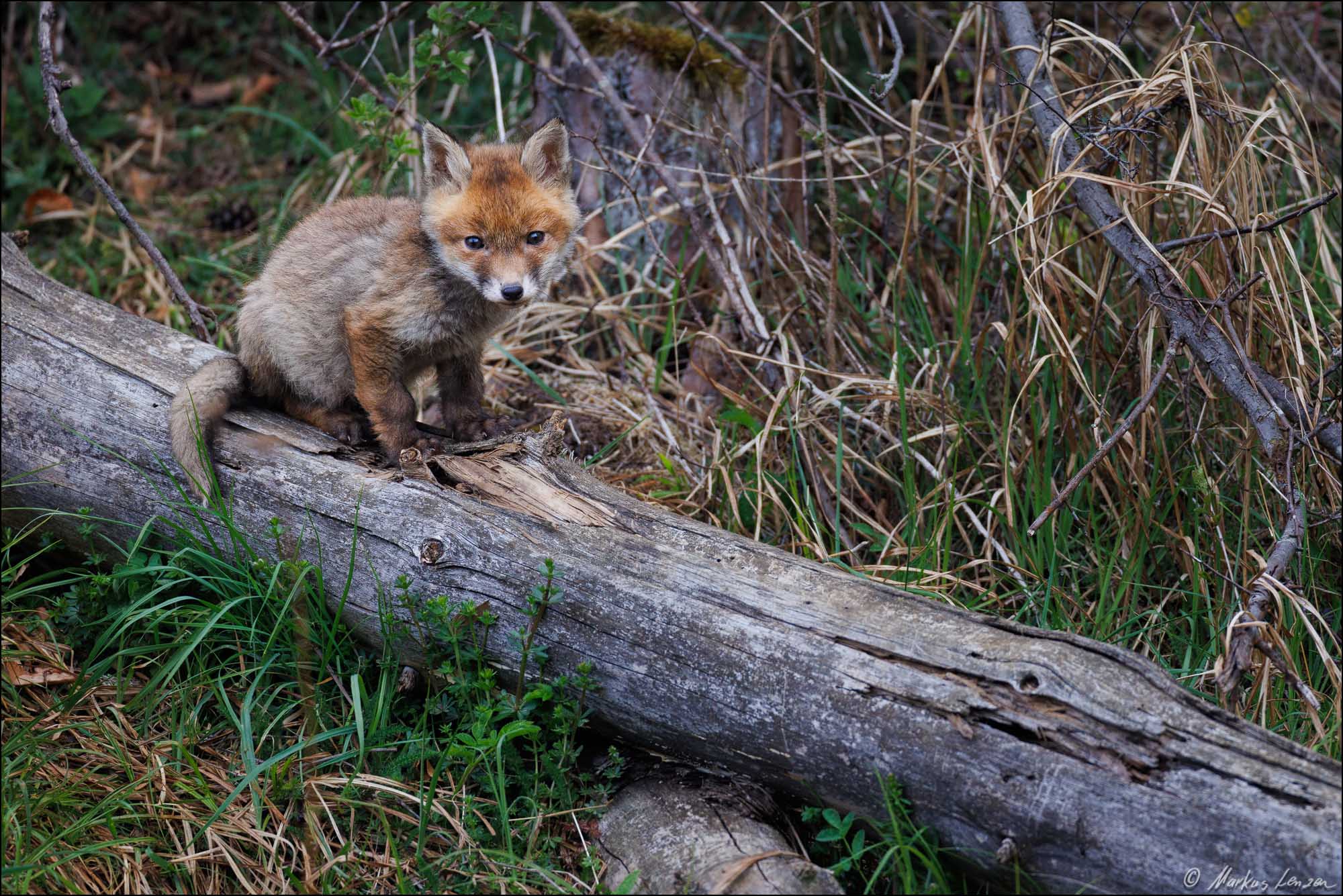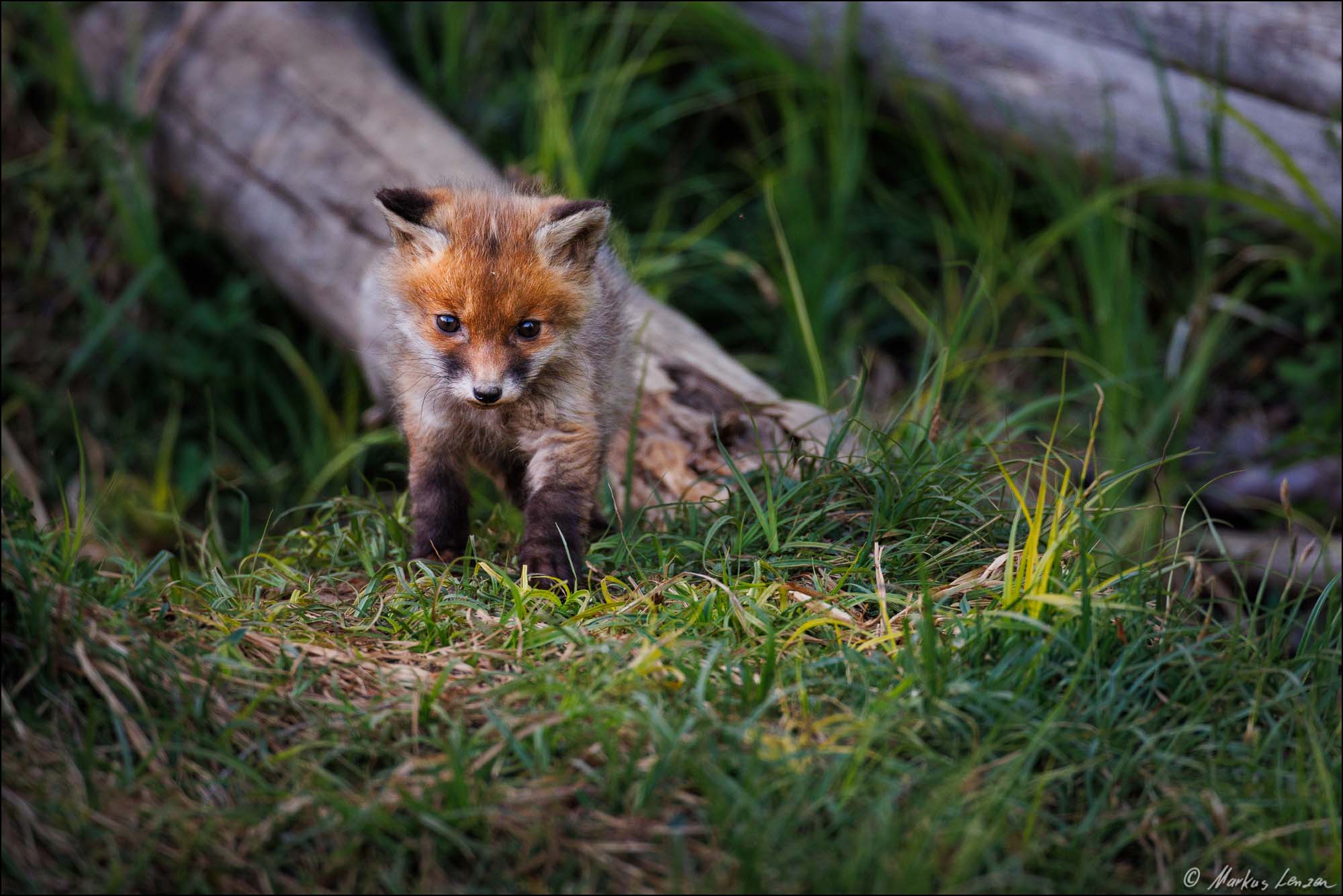 Ich konnte es fast nicht glauben. Ein kleiner Fuchswelpe saß ca. 20m von mir im Gras und schaute mich einfach an. Ich bewegte mich nicht und wir schauten uns einfach eine Zeit lang gegenseitig an. Plötzlich schaute ein zweiter Fuchswelpe hinter einem Grasbüschel hervor. Das gibts es doch nicht!! Da ich nur Makroobjektive dabei hatte, und das bei weitem nicht genug Brennweite war, genoß ich den Moment einfach und zog mich dann langsam zurück. Das tolle dabei war, dass sich der Fuchsbau in der Nähe eines Wanderweges befand, und den Kleinen Welpen daher Menschen nicht komplett unbekannt waren und sie deshalb nicht so extrem scheu waren.