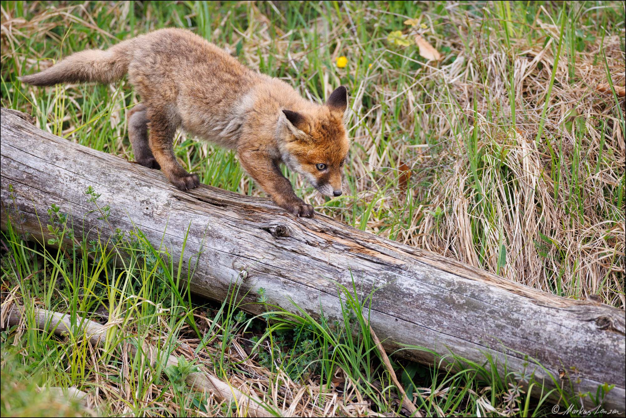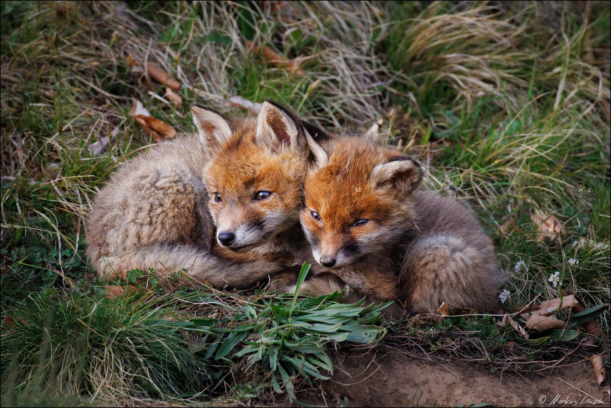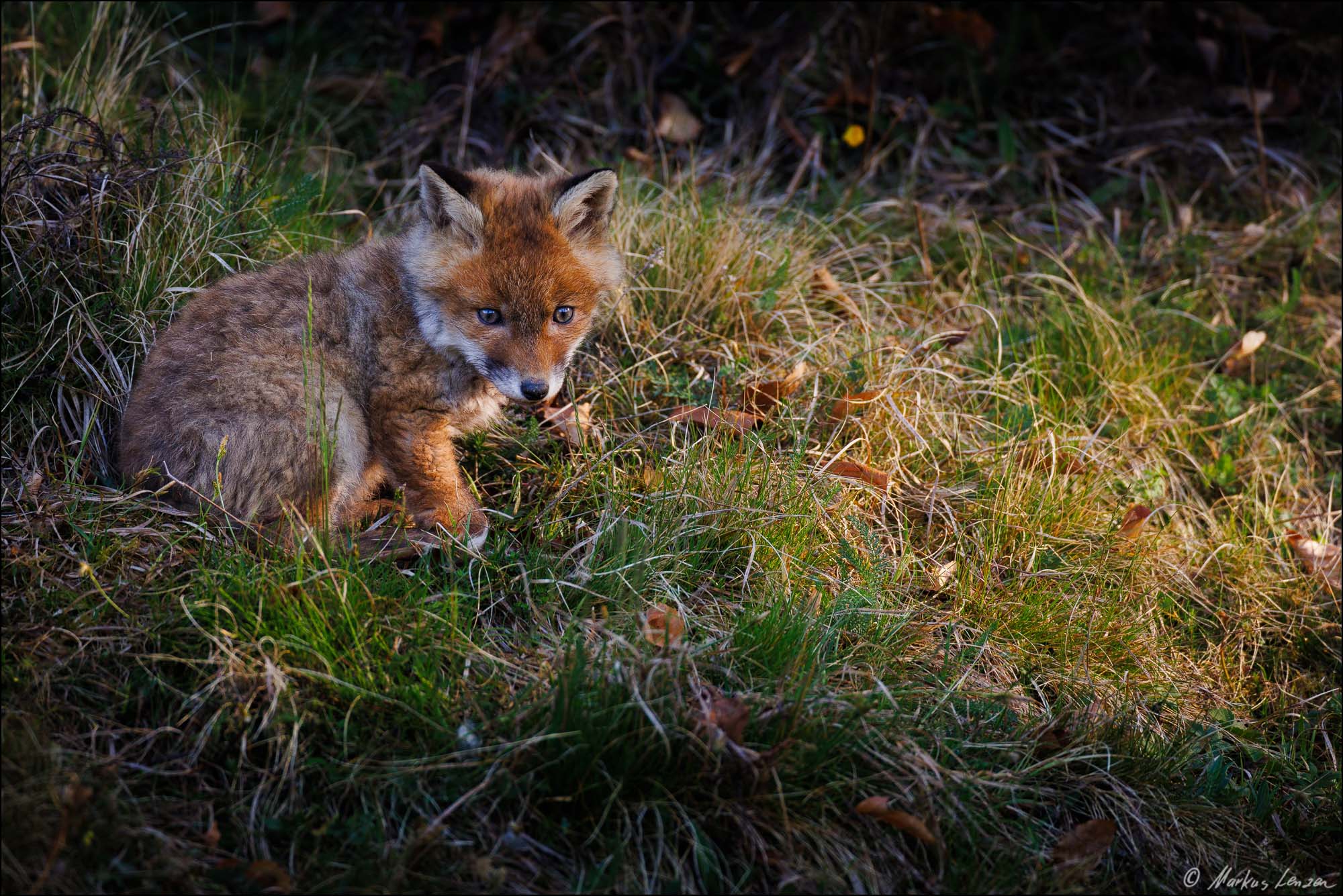 Ich konnte es fast nicht glauben. Ein kleiner Fuchswelpe saß ca. 20m von mir im Gras und schaute mich einfach an. Ich bewegte mich nicht und wir schauten uns einfach eine Zeit lang gegenseitig an. Plötzlich schaute ein zweiter Fuchswelpe hinter einem Grasbüschel hervor. Das gibts es doch nicht!! Da ich nur Makroobjektive dabei hatte, und das bei weitem nicht genug Brennweite war, genoß ich den Moment einfach und zog mich dann langsam zurück. Das tolle dabei war, dass sich der Fuchsbau in der Nähe eines Wanderweges befand, und den Kleinen Welpen daher Menschen nicht komplett unbekannt waren und sie deshalb nicht so extrem scheu waren.