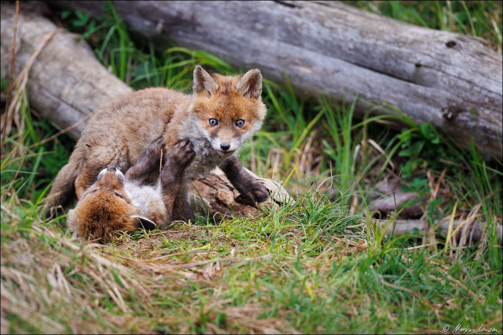 Zwei Fuchswelpen beim Rangeln, der eine beißt dem anderen in den Schwanz