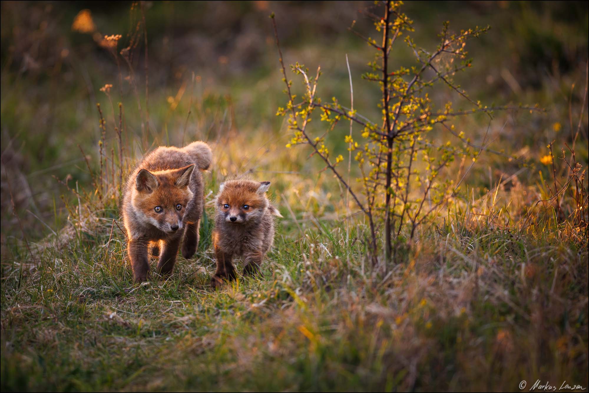 Zwei Fuchswelpen laufen nebeneinander im Abendlicht durch die Wiese