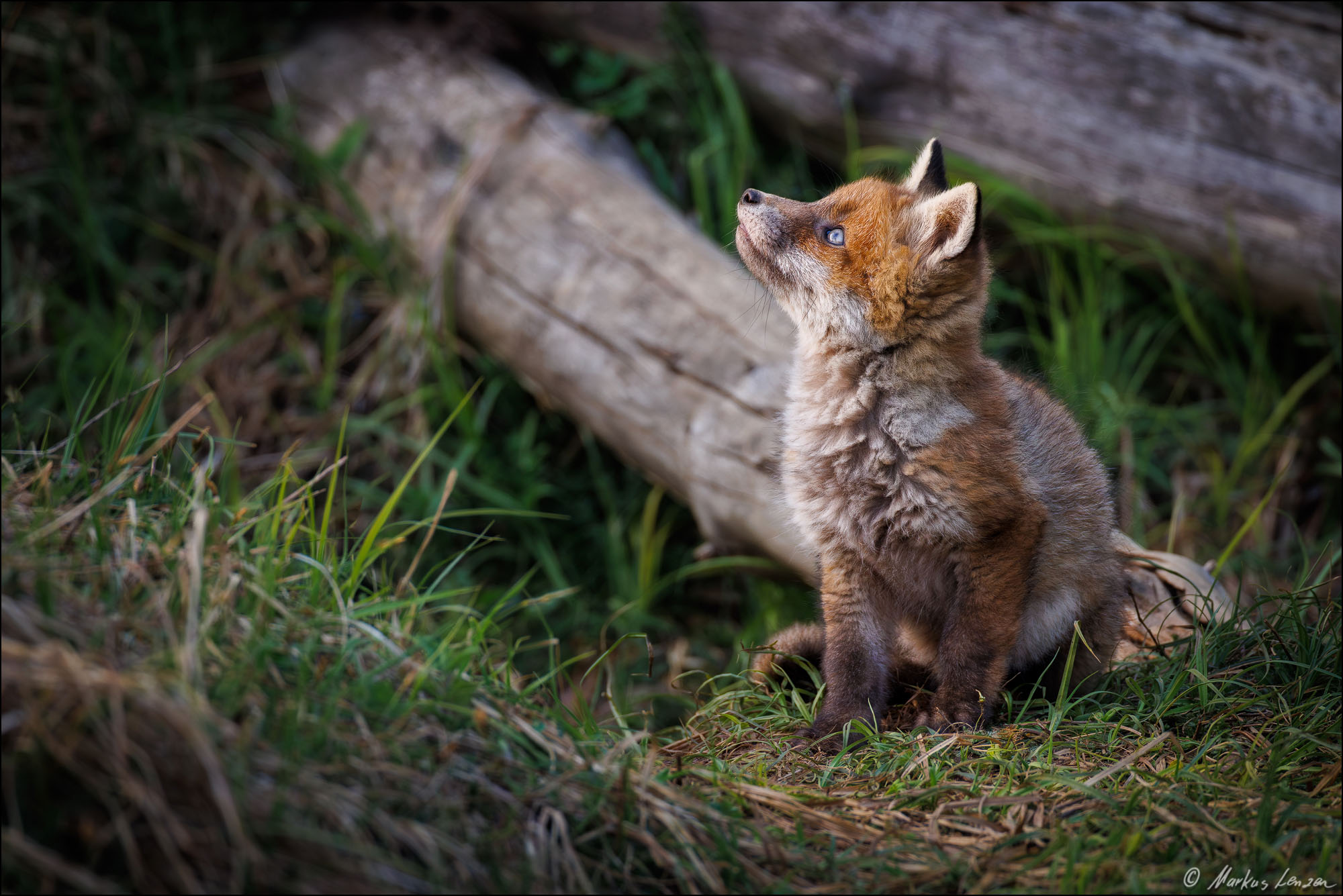 Fuchswelpe sitzt im Gras und blickt Richtung Himmel