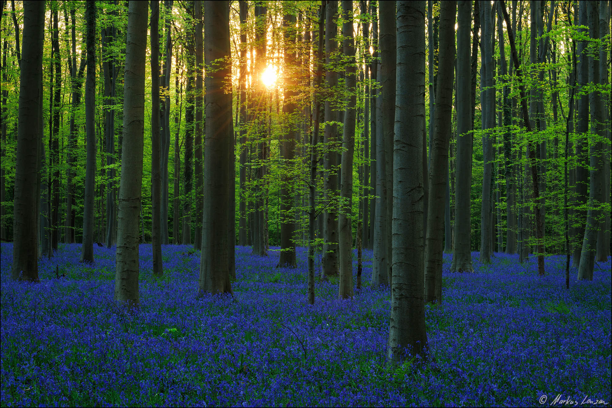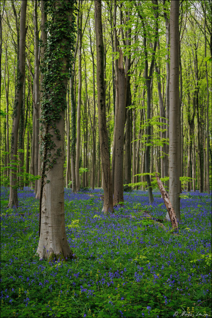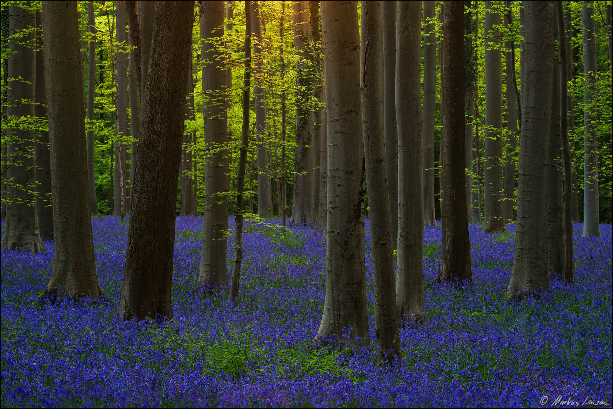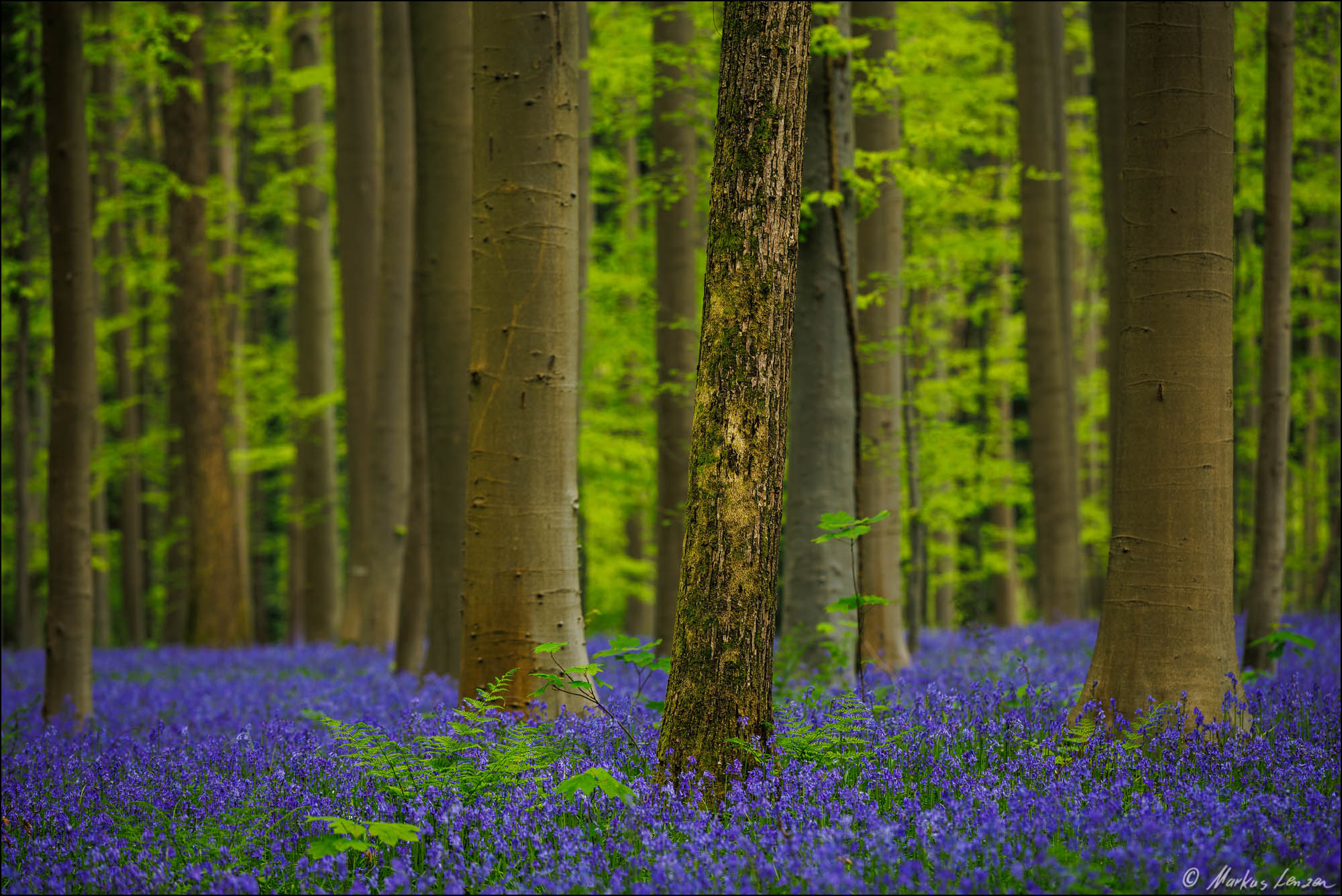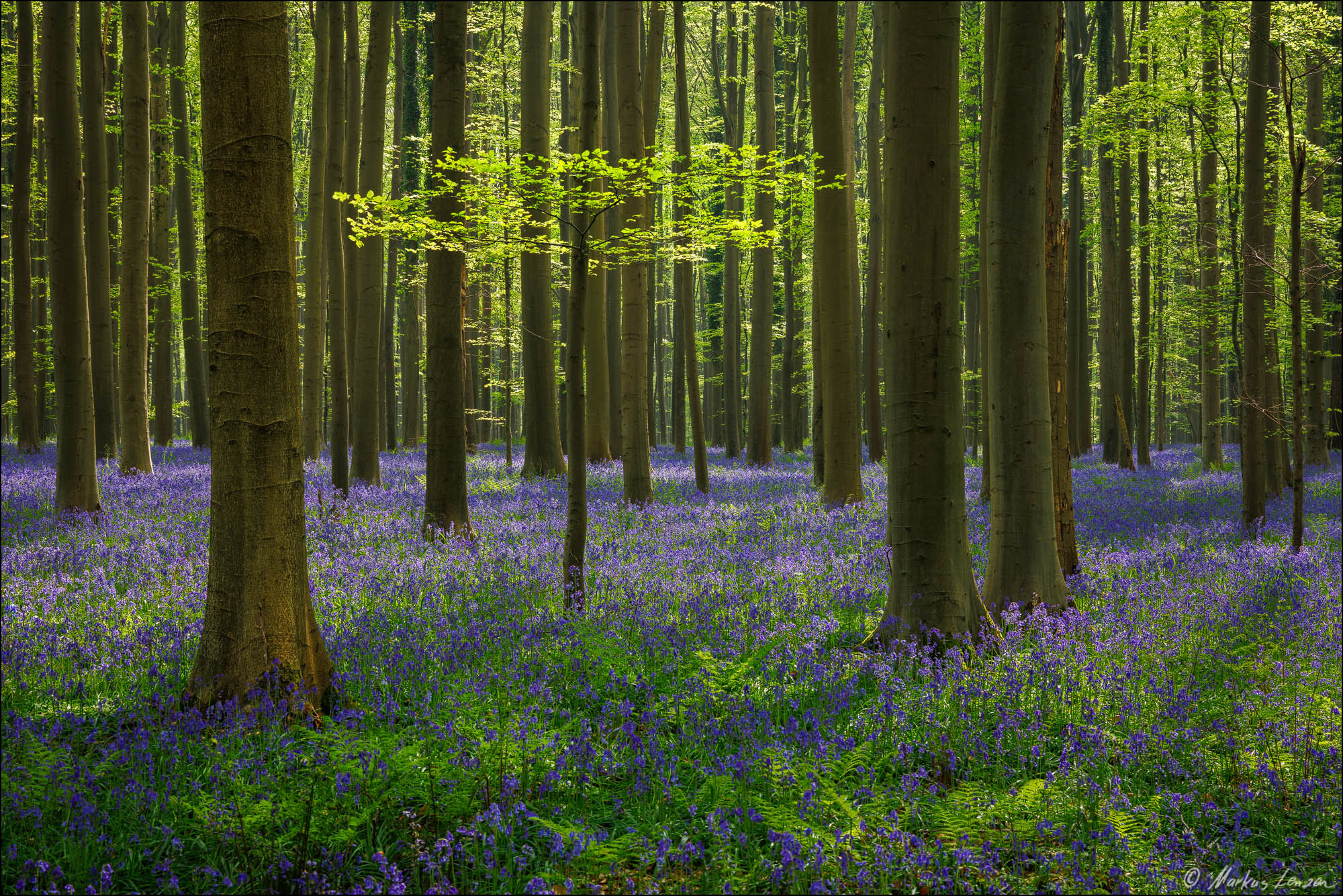 Stell dir einen Waldboden vor, der nicht nur von ersten Grün, sondern auch von schimmernden Blautönen durchzogen ist. Zwischen moosbedeckten Baumstümpfen und frischen grünen Farnen blitzen tausende zarte Blüten der Hasenglöckchen hervor. Im Gegenteil dazu leuchten die Blätter der Bäume in kräftigen frischen Grüntönen und bieten einen tollen Kontrast.