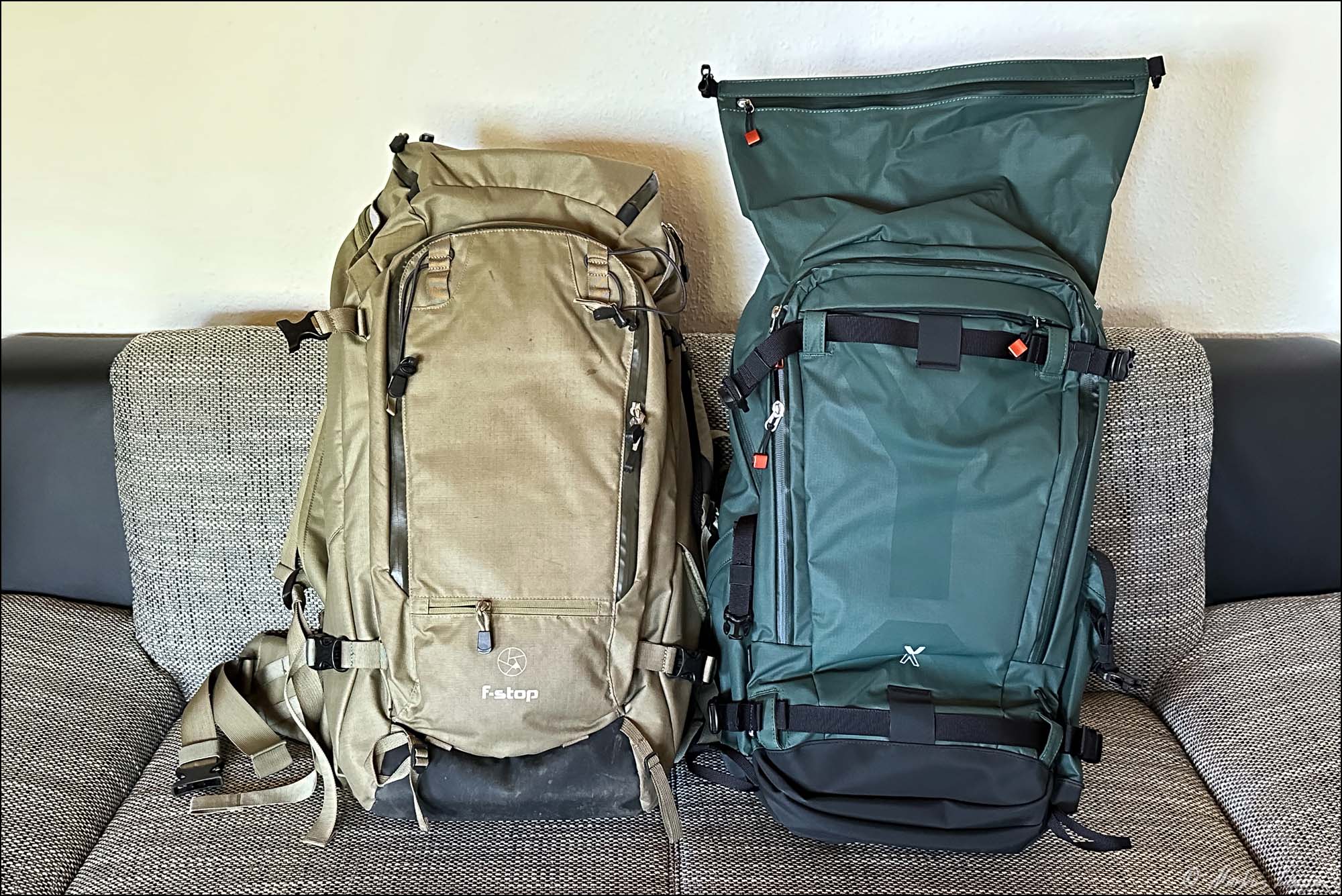 Zuvor nutzte ich viele Jahre den F-Stop Sukha. Oben mal zwei Bilder die einen recht guten Größenvergleich bieten. Man sieht sehr schön, dass der F-Stop Suhka an sich größer ist, aber nach dem Ausrollen des Rolltops der NYA-EVO Fjord 60-C größer ausfällt.