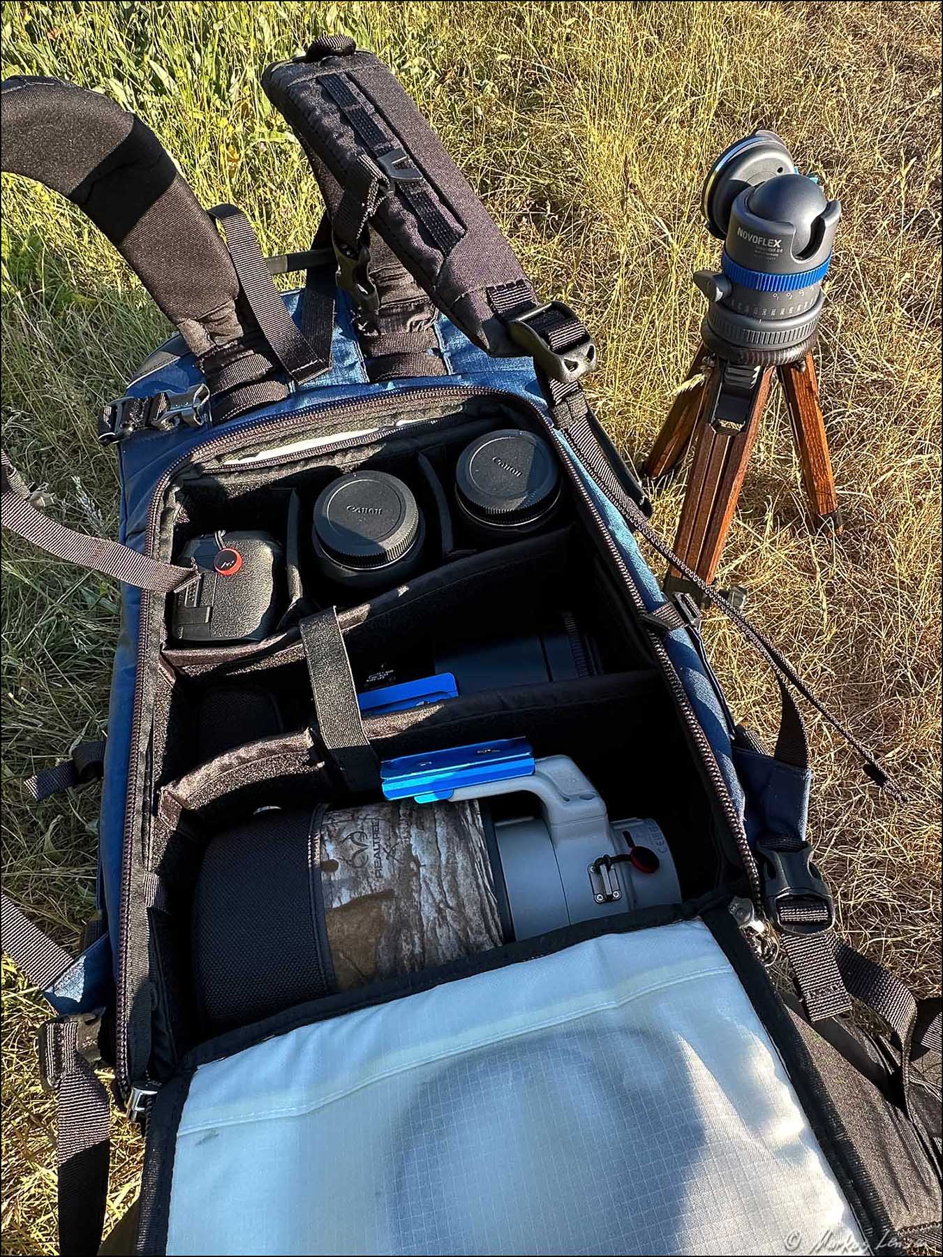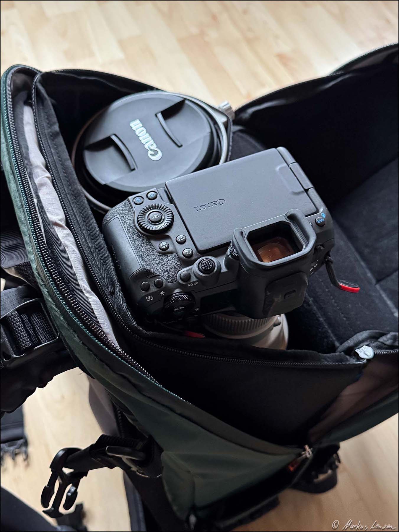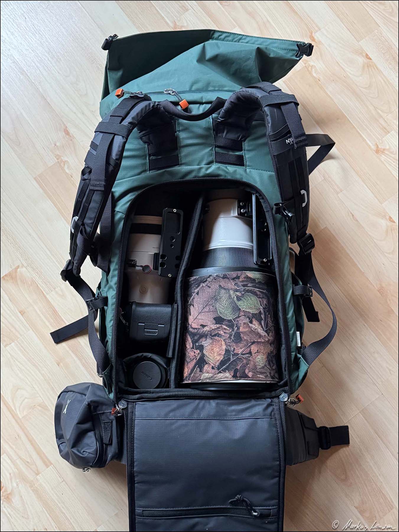 Trotzdem passt mit der großen XL-RCI sogar ein Canon RF600 f4 Supertele mit angesetzter R5 in den Rucksack. Auch ein weitere Objektive, zb. sogar ein 300 f2,8 Supertele passt noch mit einer zweiten Kamera daneben!