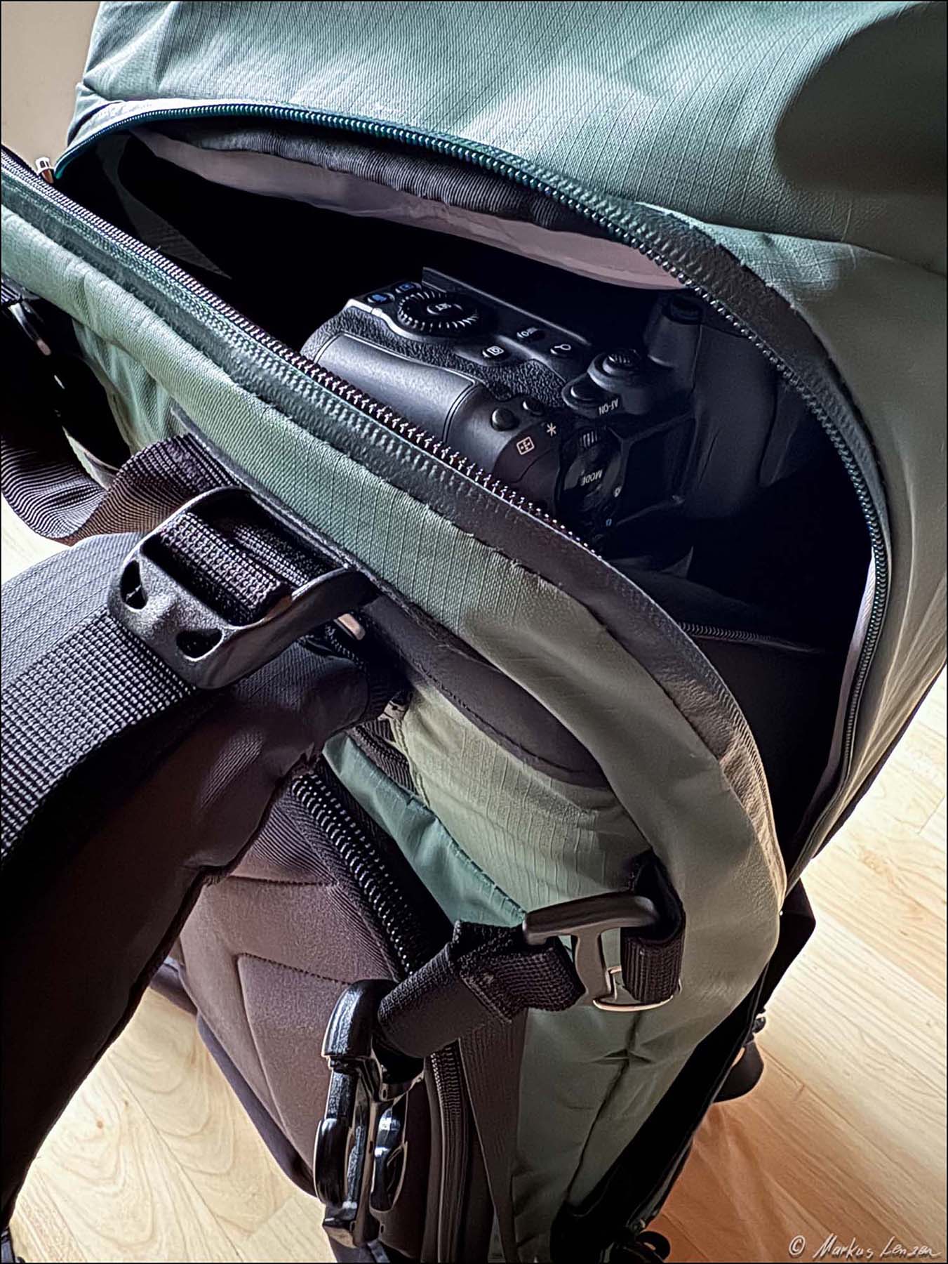 Ich nutze den Rucksack auch zum Transport dieser Kombination sehr gerne und komme auch gut damit zurecht. Denoch muss ich zugeben, dass ich mir inzwischen tatsächlich hin und wieder doch einen etwas größeren Rucksack wünsche. Insbesondere wenn ich noch mehr Objektive mitnehmen möchte 😉