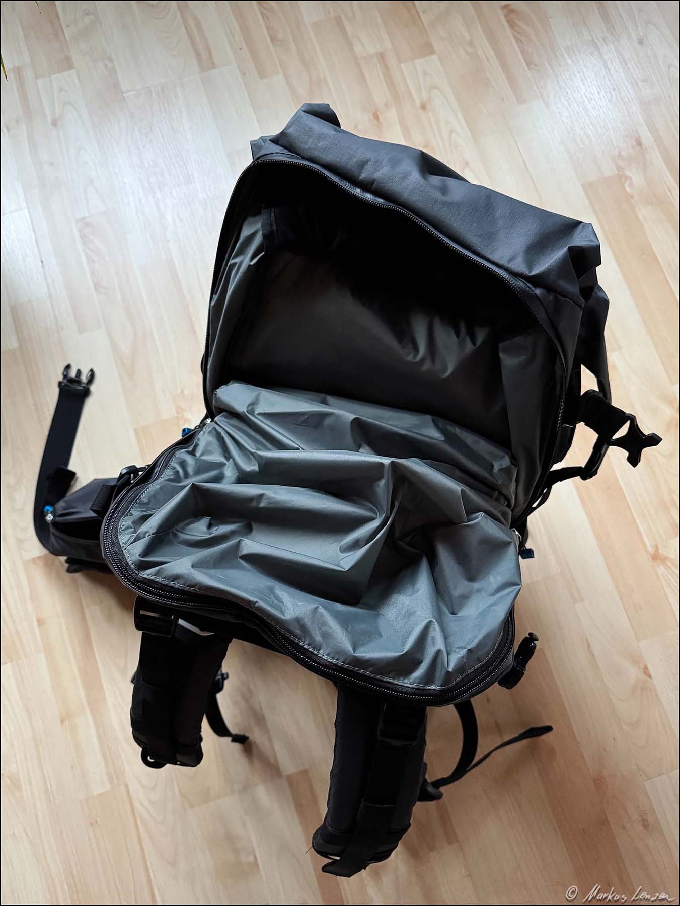 Das Rolltop nutze ich dann bei Tagestouren meistens für eine zusätzliche Regenhose oder auch Lebensmittel. Was mir dabei besonders gut gefällt, ist dass das Rolltop komplett isoliert und abgedichtet vom Kamerafach ist. So kann man z.B. auch nasse Kleidung transportieren ohne das die Feuchtigkeit in den Kamerabereich gelangt.