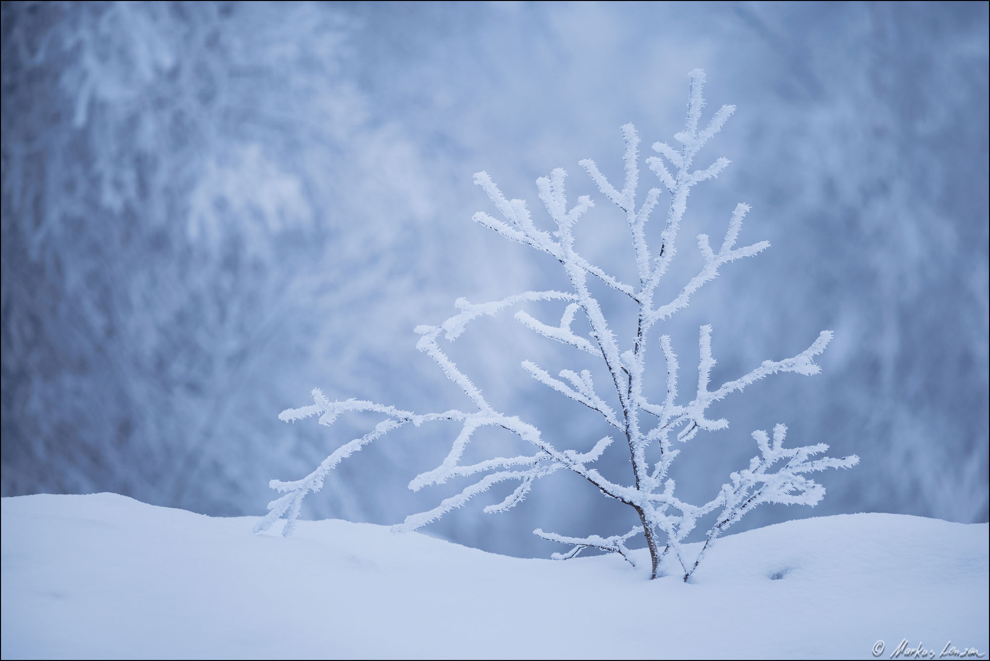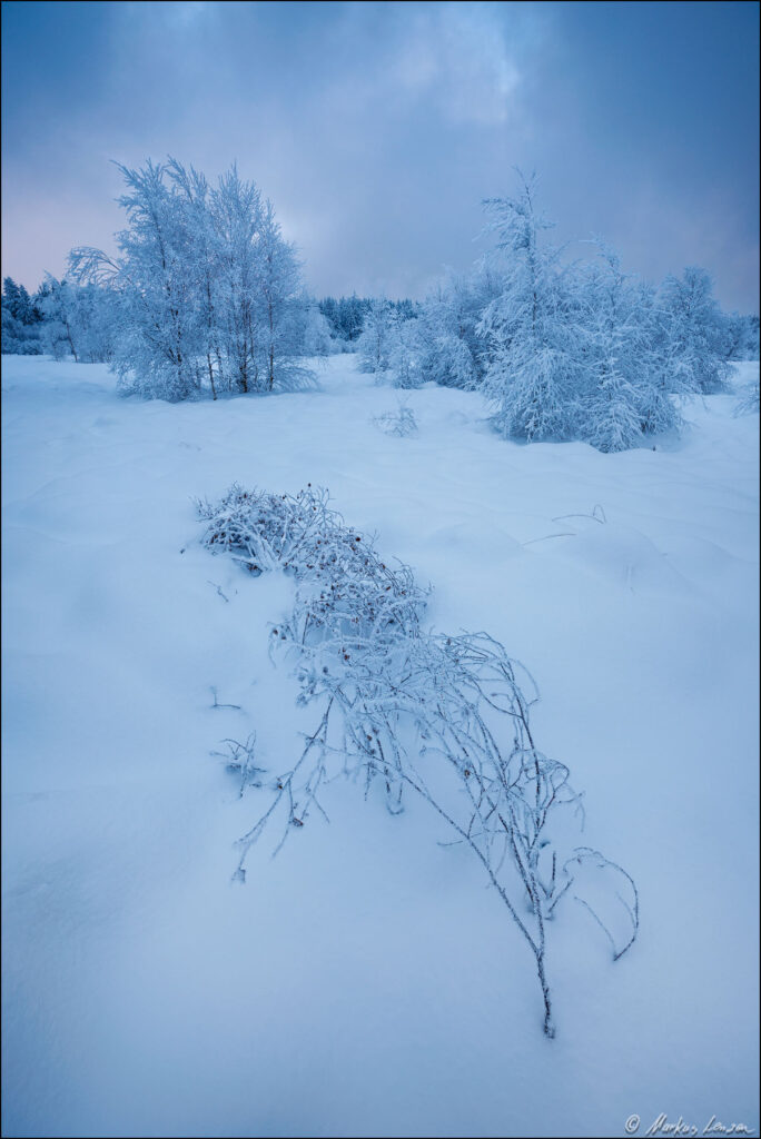 In den nächsten Tagen schneite es dann noch mehrfach ergiebig, sodass die Schneedecke noch einmal deutlich anwuchs. Die vereisten Sträucher, die an den Vortagen noch mit wunderschönen Eisdetails ihren Blick auf sich zogen, waren jetzt fast vollständig von einer dicken, einheitlichen Schneedecke bedeckt! Auch die fasziernden Konturen durch die Schneeverwehungen waren jetzt nicht mehr zu sehen. Leider war auch an diesem Morgen Licht und damit verbundene Lichtstimmungen Mangelware. Nur ganz kurz konnte man durch die Sonne durch eine hellere Stelle in der Wolkendecke erahnen.